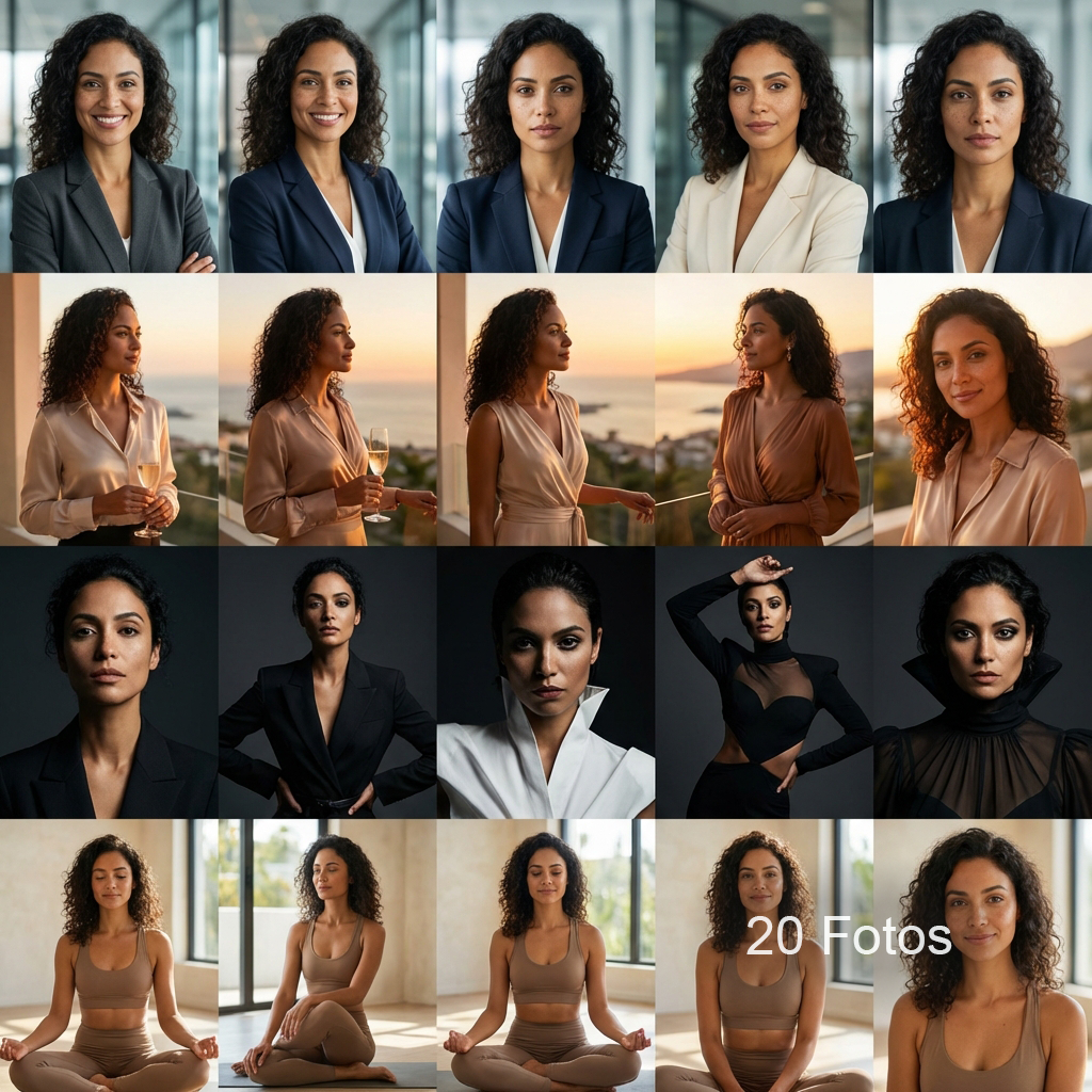 20 fotos profesionales con calidad de estudio, creadas con IA — sin sesión fotográfica.